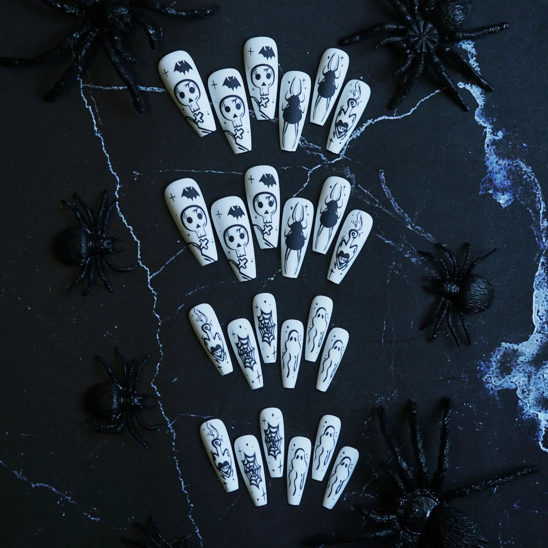 Get ready for spooky season with our Halloween Press On Nails in a bold long coffin ballerina shape. Featuring gothic skulls, frosted cobweb details, and Y2K-inspired style, these artificial nails create the perfect mix of scary and stylish.